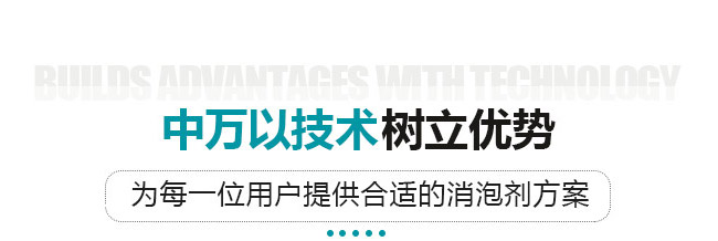 中萬是一家以解決各行業(yè)泡沫難題為使命的企業(yè),專注于各行業(yè)不同工藝的泡沫應(yīng)用研究,擁有8大體系成分產(chǎn)品,近2000個不同行業(yè)、不同細(xì)分領(lǐng)域工藝的成功應(yīng)用經(jīng)驗與解決方案,為您的生產(chǎn)工藝保駕護航。中萬在化工泡沫領(lǐng)域扮演著重要的角色,從嚴(yán)謹(jǐn)?shù)倪x料到獨特的應(yīng)用方案,推動著整個消泡劑行業(yè)的優(yōu)化升級,中萬因領(lǐng)先而備受推崇,用技術(shù)成就高效,提方案帶來卓越,讓服務(wù)適應(yīng)市場,中萬在消泡劑精益求精的道路上不斷地為客戶謀發(fā)展而開拓創(chuàng)造。